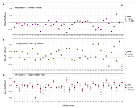 We then investigated how domestic ancestry was influenced by local genetic diversity, stocking intensity and recombination rate at the linkage group (LG) level. For this, linkage groups were analyzed separately by building linear mixed models which included as fixed effects the best-supported combination of variables (i.e., recombination, genetic diversity and stocking intensity, see Results Section 3.2) evaluated at the genome level. The 2-Mb sliding windows were incorporated as random effect. We evaluated the three possible scenarios presented in Figure 1 across the 42 LG by reporting the slope coefficient of the fixed effects and their 95% confidence intervals. We also calculated p-values to evaluate the significance of the three explanatory variables across linkage groups. To correct for multiple testing, we applied the conservative Bonferroni correction and only values with p < 0.001 were considered significant (i.e., αcorrected = 0.05/42 LGs) []. All analyses were performed using the R package “LME4” [].