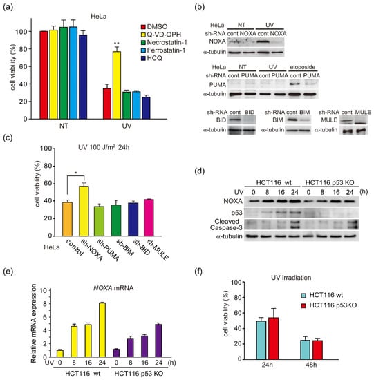 NOXA is a regulator of UV-induced apoptosis. (a) HeLa cells were irradiated with UV light (100 J/m2) in the absence (DMSO) or presence of programmed cell death inhibitor; apoptosis (Q-VD-OPH; 20 µM), necroptosis (Necrostatin-1; 30 µM), ferroptosis (Ferrostatin-1; 2 µM) and autophagy (HCQ; 20 µM). Error bars indicate S.E.M. (n = 3). (** p < 0.01, Welch’s t-test; n = 3). (b) HeLa cells stably expressing shRNA-targeting NOXA (sh-NOXA), PUMA (sh-PUMA), or sh-control were irradiated with UV light (100 J/m2) or stimulated by etoposide (100 µM). After a 24 h treatment, 20 μg of total cell lysates was subjected to immunoblot analysis with the indicated antibodies (upper panel). HeLa cells stably expressing shRNA-targeting BIM (sh-BIM), BID (sh-BID), MULE (sh-MULE), or sh-control were analyzed by immunoblot analysis (lower panel). Quantitative analysis of immunoblot results is shown Supplementary Figure S1a. (c) HeLa cells were irradiated with UV light (100 J/m2). After a 24 h treatment, cell viability was determined using CCK-8 analysis. Error bars indicate S.E.M. (n = 3). (* p < 0.05, Welch’s t-test; n = 3). (d–f) Cells were irradiated with UV light (100 J/m2). After the indicated treatment time, cells were analyzed by immunoblot analysis using indicated antibodies (d). Anti-cleaved caspase-3 antibody recognizes the large subunit of active caspase 3, immature p19 and fully mature p17 [34], but not the small subunit (p12) and uncleaved procaspase-3. In the following experiments, both p19 and p17 were often detected, but depending on the experimental condition, only active p17 was detected. Quantitative analysis of immunoblot results is shown in Supplementary Figure S1b. NOXA mRNA levels were determined by qPCR (e). Cell viability was determined using CCK-8 analysis. Error bars indicate S.E.M., (n = 3) (f).