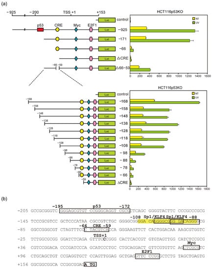 To determine the p53-independent induction mechanism of NOXA, we generated truncated human NOXA promoter luciferase constructs (Figure 3a). As previously reported, the NOXA promoter contains several functional transcription binding elements: p53 [8], activating transcription factor (ATF) 3/ATF4 [44], cyclic Adenosine monophosphate (AMP)-responsive element binding protein (CREB) [45], MYC [46], and adenovirus E2 promoter-binding factor 1 (E2F1) [47]. In HCT116 p53 KO cells, UV light-stimulated expression, as well as basal level expression, was highly induced in the NOXA promoter containing −925 to +153 from the transcription initiation site (−925 Luc) and in the −172 Luc lacking the p53 binding site (Figure 3a, upper). In −158 Luc, the promoter activity was decreased to about half of that in −168 Luc, but still showed high promoter activity. However, in −88 Luc, basal and UV light-induced promoter activities were decreased to approximately 6% of that in −168 Luc (Figure 3a, lower panel), which suggested that a UV light-responsive element(s) existed within this region. Additionally, transcription factors CREB and ATF3, which are thought to bind to and activate cAMP-response elements (CREs), are reportedly activated by UV light [48,49]. However, −66 Luc containing a CRE showed a weak basal level of promoter activity and weak induction by UV light. These results support the results showing that CRE is not the main UV-responsive element of the NOXA promoter (Figure 3a). Furthermore, −98 Luc showed a decrease in promoter activity compared with −108 Luc. This result suggested that a DNA element important for basal and UV light-induced promoter activity existed between −108 and −66, especially in the region containing −98. Therefore, we searched for putative transcription factor binding sites in this region via TFSEARCH database analysis (http://www.cbrc.jp/research/db/TFSEARCH.html; accessed on 20 October 2011), and found that two overlapping Sp1/KLF4 binding motifs exist in the −108 to −88 region (Figure 3b).
