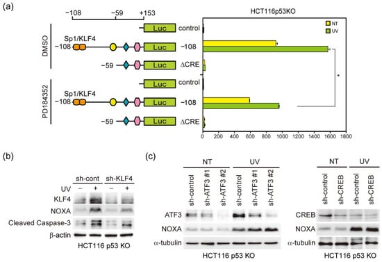 KLF4 is responsible for the p53-independent induction of NOXA expression by UV light irradiation. (a) After 24 h of transfection of reporter constructs, HCT116 p53 KO cells were treated with PD184352 (5 µM) prior to UV light irradiation. Cells were irradiated with (green bars) or without (yellow bars) UV light for 24 h, after which Firefly- and Renilla-dependent luciferase activities were determined. Firefly-dependent luciferase activity was normalized by the respective Renilla signal. Data are shown as the mean ± S.D. (n = 3). Each value represents an average from three independent experiments. (b,c) HCT116 p53 KO cells stably expressing shRNA-targeting KLF4 (sh-KLF4), ATF3 (sh-ATF3 #1, sh-ATF3 #2), CREB (sh-CREB) or sh-control were irradiated with UV light (100 J/m2). After 24 h of irradiation, 20 μg of total cell lysates was subjected to immunoblot analysis with the indicated antibodies. Quantitative analysis of immunoblot results is shown in Supplementary Figure S3a,b.