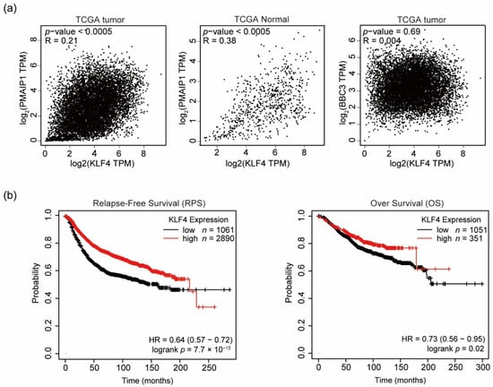The Kaplan–Meier plotter tool (http://kmplot.com/analysis/index.php?p=service& accessed on 7 November 2020) was used to perform Kaplan–Meier survival analysis for breast cancer patients based on mRNA expression levels. Patients were categorized into high and low groups by expression profiles of KLF4 (220266_s_at), with the best performing threshold as the cutoff. A scatter plot of the correlations between KLF4 and PMAIP1 and between KLF4 and BBC3 expression were analyzed by GEPIA (http://gepia.cancer-pku.cn/detail.php?clicktag=correlation###; accessed on 5 November 2020)) using The Cancer Genome Atlas (TCGA) datasets for tumor and normal tissues.