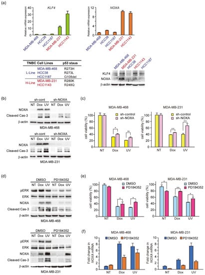 To investigate the role of NOXA in the apoptosis of TNBCs, we analyzed five TNBC cell lines with a mutated p53 gene and found cells in which both KLF4 and NOXA mRNA and protein expression levels were high (H-lines MDA-MB-231 and HCC1143) or low (L-lines MDA-MB-468, HCC38, and HCC1187) (Figure 6a). We further assessed whether UV light induced ERK-mediated expression of NOXA and NOXA-mediated apoptosis in L-line MDA-MB-468 and H-line MDA-MB-231 cells as observed in HeLa and HCT116 cells. In this experiment, the effect of DNA-damaging agent doxorubicin, which is also used for treatment of TNBC [50], was analyzed simultaneously. As a result, UV light and doxorubicin induced NOXA protein expression and caspase-3 activation in both cell types (Figure 6b). Moreover, NOXA knockdown partially reduced apoptosis induction (Figure 6c) by these stimuli that induce DNA damage, which suggested that DNA damage induced NOXA-mediated apoptosis in TNBC cells. Additionally, ERK inhibitor PD184352 suppressed DNA damage-induced NOXA protein expression, Caspase-3 activation, and apoptosis in both types of cells (Figure 6d–f). In MD-MB-468 cells, expression of NOXA protein and mRNA induced by Dox and UV light was suppressed by PD184352 (Figure 6d, upper and Figure 6f, left). Conversely, in MDA-MB-231 cells, the degree of NOXA protein suppression by UV light was not as high (Figure 6d, lower). As the amount of NOXA protein is regulated by the ubiquitin-proteasome system [51], it is possible that UV light-, but not Dox-, specific protein stabilization signals operated specifically in MDA-MB-231 cells. In any case, these results suggest involvement of DNA damage-induced NOXA expression mediated by the ERK pathway in apoptosis of p53-mutated TNBC cells, such as p53-independent apoptosis.