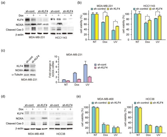 Next, we analyzed the role of KLF4 in DNA damage-induced apoptosis in H- and L-lines. First, induction of NOXA protein, Caspase-3 activation, and apoptosis by doxorubicin in H-lines MDA-MB-231 and HCC1143 was suppressed by KLF4 knockdown (Figure 7a,b), which suggested that KLF4-induced NOXA was involved in DNA-damage induced apoptosis in H-lines. Unexpectedly, Dox reduced KLF4 expression in MDA-MB-231 cells, but not in HCC1143 cells. However, KLF4 knockdown suppressed NOXA expression and induction of apoptosis (Figure 7a,b). It has been reported that the transcriptional activity of KLF4 is regulated post-transcriptionally [52]. Therefore, it is possible that Dox enhanced the transcriptional activation ability of KLF4 to induce NOXA, although Dox reduced the amount of KLF4 protein in MDA-MB-231 cells. We also found that the induction of NOXA mRNA was suppressed by KLF4 knockdown in MDA-MB-231 cells (Figure 7c), which supported that KLF4 activated transcription of the NOXA gene. Conversely, in L-line MDAMB-468 and HCC38 cells, the expression level of KLF4 protein was low and KLF4 knockdown did not affect the induction of NOXA protein, Caspase-3 activation, or apoptosis by doxorubicin (Figure 7d,e). These results suggest that NOXA-mediated mechanism other than KLF4 in L-lines partially induces apoptosis. Indeed, NOXA knockdown attenuated apoptosis in L-Line MDA-MB-468 cells (Figure 6c).