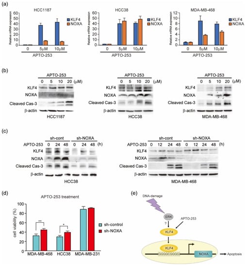 The above results indicate that NOXA is partially involved in the induction of apoptosis in both TNBC L-lines and H-lines. As it has been reported that apoptosis-inducing function of NOXA is suppressed in constitutive NOXA-high expressing cancer cells—especially in hematopoietic cancers [53]—we considered that increasing the induction of NOXA by KLF4 in L-lines enhances the induction of apoptosis. Therefore, we analyzed the effect of KLF4-activating agent APTO-253 in L-lines, which may correspond to KLF4-low expression patients (Figure 5b). As previously shown [24,25], APTO-253 activated mRNA expression of KLF4 in L-lines (Figure 8a). Moreover, mRNA expression of NOXA was also induced by APTO-253. Protein expression of KLF4 and NOXA, as well as activation of caspase-3, was induced by APTO-253 in a dose-dependent manner (Figure 8b). Although NOXA mRNA and protein expression levels differed among these cell lines after APTO-253 treatment, it is possible that these differences were caused by the histone modification status around the NOXA gene as well as protein modification and translation efficiency in each cell line. As APTO-253 has also been shown to suppress the expression of MYC [25], we analyzed whether APTO-253 induces apoptosis through targets other than KLF4. As shown in Figure 8c, APTO-253-induced caspase-3 activation was partially suppressed by NOXA knockdown. Furthermore, APTO-253-induced cell death was also partially suppressed by NOXA knockdown (Figure 8d). In contrast to these results, as expected, APTO-253 did not enhance apoptosis in H-line MDA-MB-231 cells. These results suggest that a DNA-damage-evoked ERK signal activates KLF4, and that activated KLF4 induces transcriptional activation of NOXA. Although it is possible that APTO-253 acts on other apoptosis regulators, our results indicate that APTO-253 induces NOXA-mediated apoptosis in TNBC L-line cells (Figure 8e). Our findings suggest that APTO-253 may be a candidate therapeutic agent for TNBC.