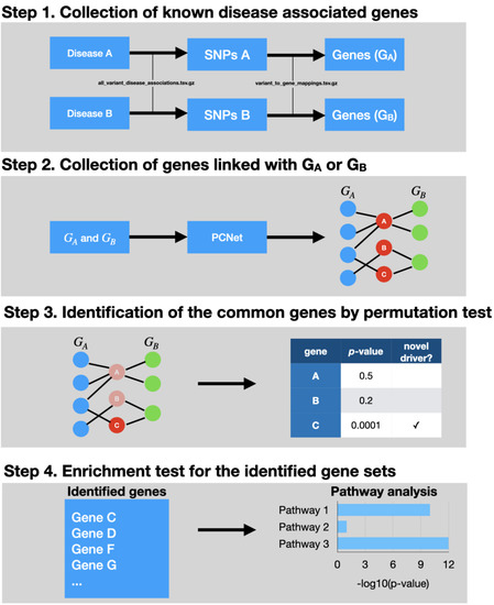 NICD is a computational approach and requires a biological network and multiple gene sets for each disease of interest. The biological network is used to detect genes and is physically linked with databases of gene sets. In this study, we used PCNet v1.3 [10]. PCNet is a composite network and was constructed for the purpose of identifying common diseases genes. We downloaded the network from the National Data Exchange (NDEx UUID: f93f402c-86d4-11e7-a10d-0ac135e8bacf). We excluded the Ubiquitin C (UBC) gene from the network as this gene connects with nearly every other gene and therefore causes significant artifacts during analysis. Furthermore, the ubiquitous nature of this gene is not causally tied to a single disease mechanism. We then focused on performing permutation assays between the genes collected from both diseases, utilizing the workflow described in Figure 2.