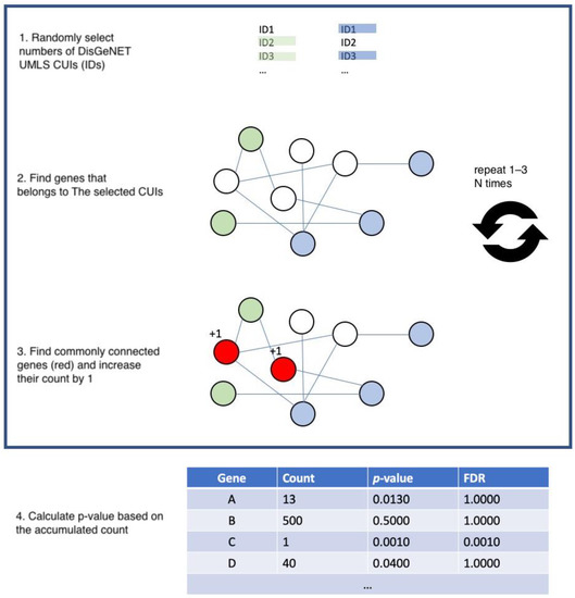 To test whether the primary candidates are selected by a random chance, NICD performs a permutation test. A permutation test is a non-parametric statistical approach to empirically estimate the null hypothesis by a random shuffling manner. It has been widely used for many bioinformatics studies such as epistasis [12], multi-omics data integration [13], and gene–gene network construction [14]. The permutation test of NICD is as follows; NICD randomly picks the same number of genes and performs an identification assay. Overlapping between the random gene list and the acquired gene list could be due to random chance. However, while it is possible to identify overlap between the candidates and genes by chance, the findings may not be completely random. The possibility is exponential, so it is not computationally possible to calculate the probability of randomness of primary candidates. Instead of enumerating every possibility, NICD performs a permutation test as described in Figure 3.