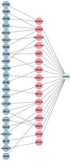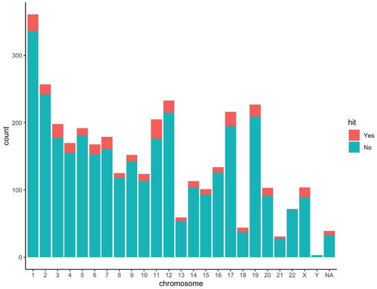 Initially, 1108 dementia-associated and 23 OSA-associated genes were identified. The aforementioned genes were used to identify 3610 genes which had links with both any OSA-associated genes and any dementia-associated genes. Following NICD with performance of permutation testing, 42 genes were identified with common associations between Alzheimer’s disease and OSA (Table 2). These identified genes by NICD were then mapped back to the pathway which the gene affects. Many of the genes were involved with G-coupled protein receptor (GPCR) and olfactory signaling pathways. Gene enrichment analysis using Enrichr found that a subset of genes (10/42) was significantly enriched in these pathways (p = 1.314 × 10−9 for olfactory transduction in the KEGG 2019 pathway library and p = 0.00002605 for signaling by GPCR in the BioPlanet 2019 pathway library) (Figure 4). The identified gene candidates were then characterized by chromosome (Figure 5).