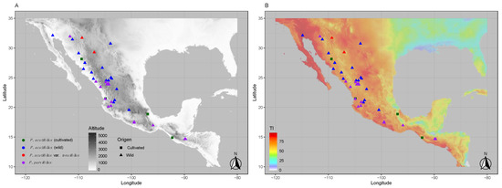 Geographical representation of collection sites for tepary beans s.l. (P. acutifolius–parvifolius clade) evaluated in this study with (A) altitude in meters above sea level as a background and (B) drought index on a 30 s grid for the region between the Southern United States and Central America, including the collection hotspot of Northwest Mexico. Dots are colored by taxonomic origin (Table S1) as follows: Green and blue for cultivated and wild P. acutifolius, red for wild P. acutifolius var. tenuifolius, and purple for wild P. parvifolius. Altitudes represented in various tones of achromatic gray. Drought severity index based on Thornthwaite’s potential evapotranspiration (PET) model (DI—Thornthwaite’s index) indicated by scales of red (most intense), orange, yellow to green, and blue (least intense). Latitude and longitude represented by grids in both panels. Wild and cultivated accessions marked as filled triangles (▲) and squares (■), respectively.