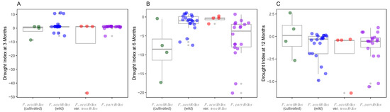 Dispersal graph boxplots for habitat drought stress index in four taxonomical divisions of broad sense (s.l.) tepary bean (from the P. acutifolius–parvifolius clade) based on the Thornthwaite’s potential evapotranspiration (PET) model. Drought indices computed at (A) three, (B) six, and (C) 12 months. Colors mark taxonomy: Green and blue for cultivated P. acutifolius and wild P. acutifolius, red for wild P. acutifolius var. tenuifolius, and purple for wild P. parvifolius.
