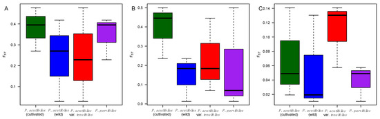Boxplots of the pairwise FST distributions at (A) Asr2, (B) Dreb2B, and (C) ERECTA-encoding candidate genes for drought tolerance in tepary bean s.l. (P. acutifolius–parvifolius clade). Boxplots colored by taxonomy: Green and blue for cultivated and wild P. acutifolius, red for P. acutifolius var. tenuifolius, and purple for P. parvifolius, the latter two wild.