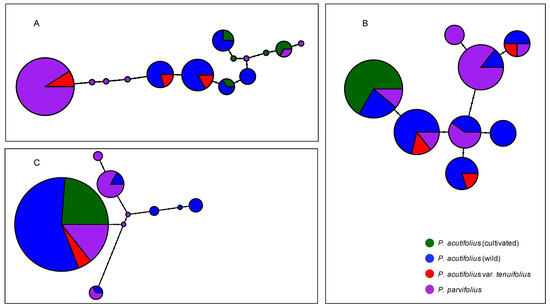 Haplotype networks of genetic polymorphism at (A) Asr2, (B) Dreb2B, and (C) ERECTA-encoding candidate genes for drought tolerance in tepary bean s.l. (P. acutifolius–parvifolius clade). Nodes represent haplotypes, its size relative to its frequency. Marks above each segment are substitutions. Nodes are colored by taxonomy (Table S1): Green and blue for cultivated and wild P. acutifolius, red for P. acutifolius var. tenuifolius, and purple for P. parvifolius, the latter two wild accessions.