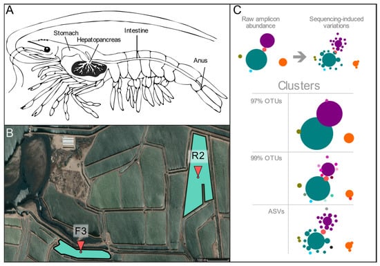 Pond location and anatomic distribution of shrimp organs. (A) Anatomical representation of L.vannamei studied organs, hepatopancreas, and intestine (both organs were taken from the same specimen). (B) Satellite overview of sample collection sites in Sinaloa, México (CNES/Airbus©, 2020). Six specimens were taken from each pond: F3 (26°01’45.4” N 109°23’52.9” W) and R2 (26°01’55.8” N 109°23’12.4” W). (C). Diagram showing the source of artefactual variation due to high-throughput sequencing and different types of clusters used in the present study. Circles represent abundance and colors different sequence identities.