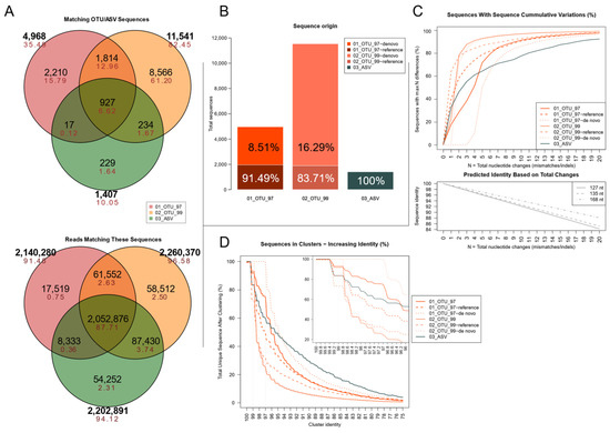 Despite the methodological differences, 927 of the cluster-sequences (12.96%) were identical among all three sets (Figure 2A). Of this three-way overlap, their corresponding clusters accounted for 87.71% of all reads. Regarding two-way overlaps, there was also a relatively sizeable cluster-sequence overlap between both OTU sets (1,814 sequences, 12.96%), although their corresponding clusters accounted for only 2.63% of all reads in all three sets. However, 234 sequences were exclusive to the 02_99_OTU, and 03_ASV sets overlap but accounted for more reads (3.74%). Only a relatively small overlap occurred between the 01_OTU_97 set and the 03_ASV (0.12% of cluster-sequences and 0.36% of all reads). Most of the 11,005 set-specific cluster-sequences in this study were found in set 02_OTU_99 (8,566 cluster-sequences, 61.20%), but these accounted for a relatively small proportion of all reads (2.50%). Despite having the minor collection of centroid sequences (229), set 03_ASV summed more reads than the unique sequences in set 01_OTU_97 (2.31% and 0.75%, respectively).