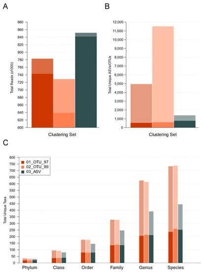 Despite having a smaller number of total reads than the ASV set, reads in both OTU sets were grouped into a larger collection of clusters, each bearing a different unique centroid sequence (Figure 2B), more noticeable in the 02_OTU_99 set. This was expected, as rising the clustering identity assigned sequences into less populated clusters, resulting in an overestimation of the actual diversity. Even differences of just a couple bases may produce additional separate OTUs, compared with the 97% identity set. On the contrary, the ASV sets had fewer clusters (Figure 2B, light bars), as was expected due to denoising, which has been suggested to be a more accurate measure of the actual diversity [18].
