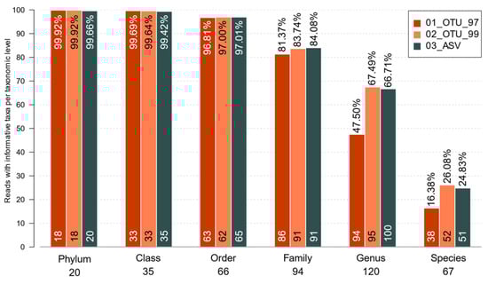 Regarding the maximum taxonomic resolution, all sets produced a similar number of total taxa with informative (non-ambiguous) taxonomical names at each taxonomic level, showing limited success at the species level (Figure 4). All three sets assigned over 80% of all reads with a family-level resolution. It is important to note that the other 20% did have a valid taxonomy, but the centroid sequences of those clusters were similar to multiple phylogenetically-distant sequences. That resulted in a truncated taxonomy at a lower taxonomic level, where the last common ancestor (LCA) of the resulting hits would be found. A few of these, however, were truncated due to direct assignation to incomplete taxonomies derived from the 99% reference database OTUs that was used for an assignation. At genus-level resolution, the 47.50%, 67.49%, and 66.71% of sequences in the 97%, 99% identity clusters, and ASVs were assigned, respectively (Figure 4). Likewise, 26.08% and 24.83% of the reads were assigned at the species level for 0TUs_99 and ASVs, respectively, while only 16.38% of the reads were assigned for OTUS_97 (Figure 4). To delve deeper into the possible causes of whether no species could be assigned for most sets, we traced back the sequences previous to filtering to assay their matching taxonomy. It turned out that out of the total sequences in the 01_OTU_97 set, 60.85% of all missing species were produced by a lower LCA of the clusters, whereas 39.15% were due to references having no species label. Similarly, 63.77% of 01_OTU_99 sequences had been truncated due to the LCA and 36.23% due to missing labels. Contrastingly, only 51.57% of the sequences with no species in the 03_ASV set were due to LCA, whereas 48.43% were due to missing labels.