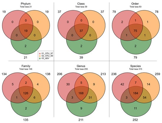 After that, we explored whether the obtained taxonomic profiles were equivalent. Venn diagrams in Figure 5 show a larger coincidence of matching taxa where 90.48% phyla, 94.87% classes, 90.36% orders, 86.30% families, 65.88% genera, and 58.41% species were detected by the three datasets. Most importantly, these taxa accounted for 99.99% reads in phyla and classes, 99.95% in orders, 99.77% in families, 97.40% in genera, and 94.95% in species (Supplementary Table S3.3). In contrast, taxa uniquely associated with a specific set represented <0.7% of reads regardless of the taxonomic level. It is also worth noting that the 03_ASV set had Archaea as their associated exclusive taxa, while set 01_OTU_97 showed the highest number of exclusive taxa; however, most corresponded to non-informative tags in higher taxonomic levels (unspecified genus and species). Interestingly, Venn diagrams of shared and unique taxa at different taxonomic levels prior to the abundance filter showed a high number of taxa associated with a specific set but with few sequences assigned (Supplementary Figure S2.2), suggesting the successful application of the abundance filter to homolog the taxonomy between clustering methods.