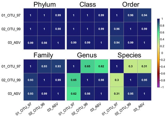 Next, we explored if the shared taxonomies were equivalent in terms of sequence abundance between the three sets. To this end, we analyzed the correlations between sets at all taxonomic levels, only considering taxa with informative tags (Figure 6). These were higher (ρ ≥ 0.93) from phylum through family levels between all three sets. The larger discrepancies were at the genus (ρ ≤ 0.65) and species levels (ρ ≤ 0.31) for the 01_OTU_97 set, showing higher correlations between the 02_OTU_99 and 03_ASV sets (ρ = 0.98 and ρ = 0.95, respectively).