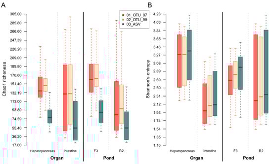 We selected two organs, the intestine, and the hepatopancreas, to test a biological variable and two ponds, F3 and R2, to test an environmental variable in the effects on within-sample (α) and between-sample (β) diversity. Thus, for further analysis, we separated the samples according to their organ and pond source. We found that all three sets identified similar α-diversity trends for organ and pond, independently of the clustering method (Figure 7). Interestingly, both OTU sets showed a significantly (α = 0.05) greater expected richness (Chao1) than the 03_ASV set (Figure 7). On the contrary, the ASV set presented lower, albeit non-significant, diversity (Shannon’s entropy), suggesting that the OTU sets have a larger population of clusters with smaller frequencies that inflate the expected richness, whereas there are a slightly larger number of equally-distributed clusters in the ASV set. Comparison of the samples’ inner diversity (richness and entropy) at the different taxonomic levels revealed the same group differences observed in the diversity of OTUs and ASVs (Supplementary Figure S2.5).