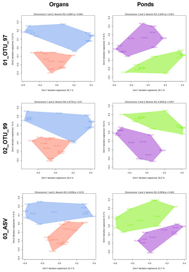 Regarding β-diversity, ordination methods produced a full separation of samples, both by organ and pond, in all three sets using composition-based (unweighted) UniFrac distances (Figure 7). This further supports compatibility between the ASV and OTU methods, validating that both approaches can separate the microbiota from different organs and different ponds. Nevertheless, these groupings accounted for only a part of the explained variation. We also found that taxonomy can also effectively identify group differences at higher levels in both ASV and OTU sets (Supplementary Figure S2.6).