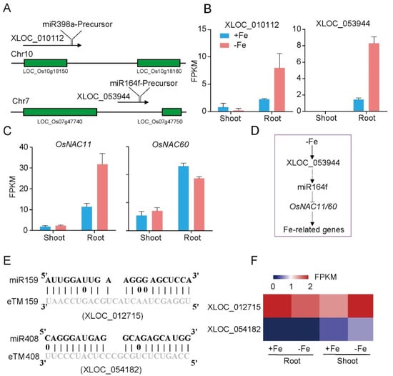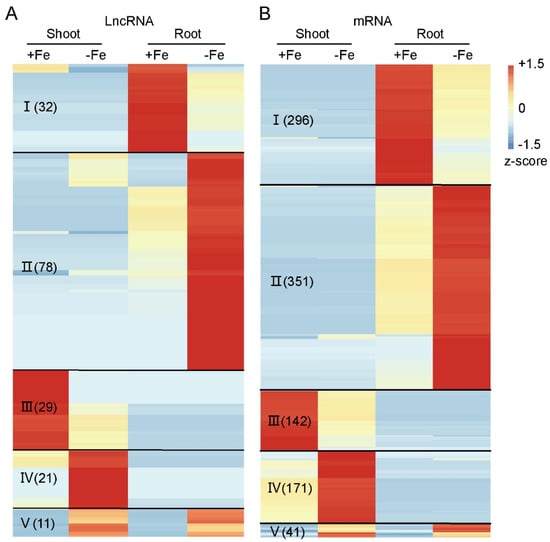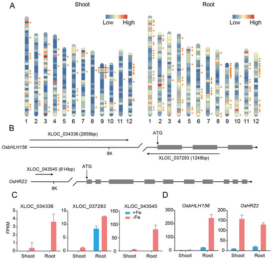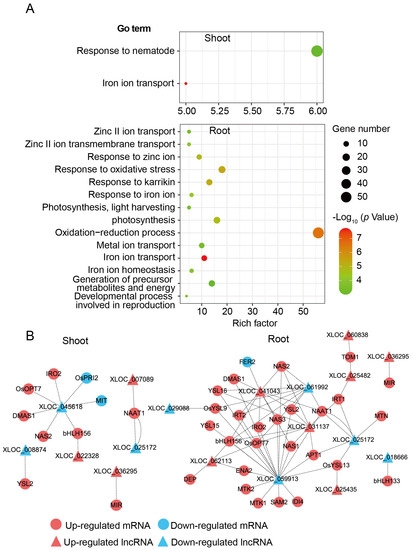 3.2. Fe-Deficiency Responsive LncRNAs and mRNAs in Rice Shoot and Root
