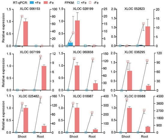 3.3. Verification of LncRNAs Responding to Fe Deficiency Using RT-qPCR