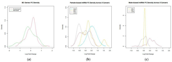 (a) FC density of genes in BC. (b) FC density of female-biased miRNA. (c) FC density of male-biased miRNA.