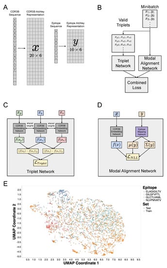 Training was performed by first randomly shuffling the training dataset for every epoch and utilizing minibatches of size 128. For each minibatch, all valid triplets of Atchley representations of CDR3B sequences were extracted and input into the Triplet Network. Additionally, the pairs of Atchley representations of CDR3B sequences and epitope sequences contained in the minibatch were input into the Modal Alignment Network. Both the Triplet Network and Modal Alignment Network were trained simultaneously by minimizing an overall loss function that combined the Triplet Loss and negative log likelihood (Supplementary Methods: Model architecture and training) and using early stopping for a set number of epochs determined by the seen epitope set.