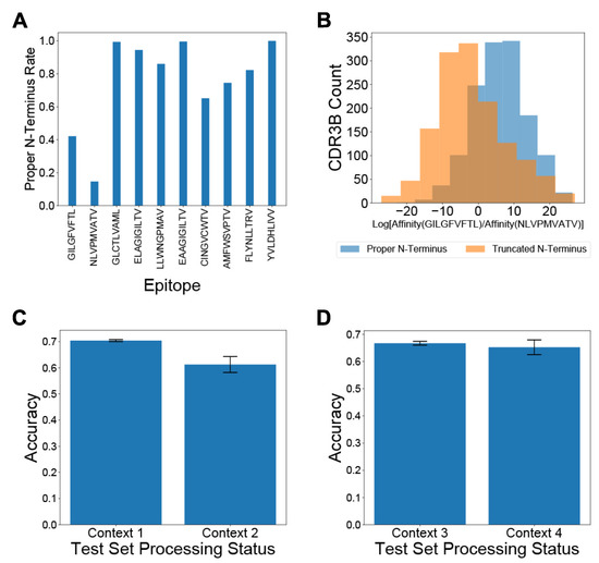 Processing CDR3B sequences reduces bias in Task 2 classification. (A) Proportion of CDR3B sequences derived from the unfixed dataset displaying proper N-terminus, arranged by binding epitope. (B) Histograms displaying the distribution of log ratios of unnormalized binding affinity towards GILGFVFTL versus NLVPMVATV for CDR3B sequences in the test set. Sequences with proper N-terminus showed a bias towards positive values, associated with preferential classification as binding the epitope GILGFVFTL, demonstrating that the model had learned epitope-specific processing artifacts. (C) Classification accuracy for CDR3B sequences binding GILGFVFTL or NLVPMVATV under Context 1 and Context 2. Discrepancy in classification accuracy between Context 1 and Context 2 demonstrated that ignoring preprocessing of CDR3B sequences may inflate assessment of the model on TCR-epitope binding prediction. (D) Classification accuracy for CDR3B sequences binding to GILGFVFTL and NLVPMVATV under Contexts 3 and 4. The similarity of classification accuracy between Context 3 and Context 4 demonstrated that preprocessing of CDR3B sequences did not introduce any new biases that would affect model assessment. Error bars represent 1 standard deviation (s.d.) of cross-validation accuracies.