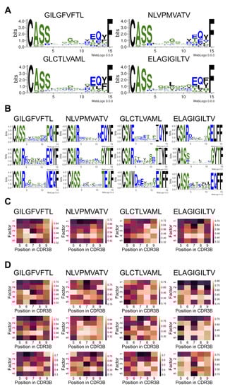 3.4. Model Interpretation Method Identifies Salient CDR3B Sequence Motifs and Amino Acid Positions Specifying Epitope Binding