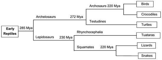 Structural studies on the epidermal appendages of birds and reptiles (sauropsids) presented in this review will draw on data, not only from the birds, but also from the crocodiles, turtles, lizards, snakes, and tuatara. An appreciation of the relationships between these vertebrates is, therefore, of some value and towards that end the phylogenetic classification of the sauropsids is shown in Figure 1. This illustrates that the archelosaurs diverged into the archosaurs (birds and crocodiles) and the testudines (turtles) about 272 Mya, and that the lepidosaurs diverged in to the squamates (lizards and snakes) and the rhynchocephalia (tuatara) about 230 Mya [1,2,3,4]. Whilst this diversification will necessarily result in important differences between the species it is expected that major similarities will remain, a supposition borne out by much of the data presented here.
