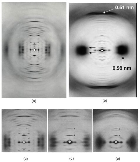 High angle X-ray diffractions patterns of (a) seagull feather rachis (Larus novae-hollandiae), which shows features of a ß-conformation, and (b) porcupine quill (Hystrix cristata), which is based on the α-conformation with its characteristic 0.51 nm meridional reflection and the 0.98 nm equatorial and near-equatorial reflections, (c,d) show the same seagull feather rachis before and after pressing in steam to remove the lateral organisation between the filaments and (e) goanna claw (Varanus varius). (b) reproduced from [43] with permission of Elsevier; (a–e) reproduced from [44] with permission of Elsevier.