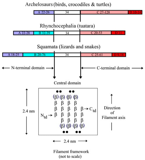 Over the past 20 years, hundreds of sequences of closely related families of corneous ß-proteins (CBP, also known as ß-keratins; [32,33]) have been published. These sequences represent every branch in the phylogenetic classification of the birds and reptiles and include, for example, those from chicken and zebra finch [34], crocodile and alligator [28,35], turtle [29], tuatara [33,36], green anole lizard [37], and snake [26]. Chains from each of these protein families form the 3.4 nm diameter filaments that exist in that particular species. A much smaller number of sequences of the closely related families of chains that assemble to form the 7–10 nm KIF in the sauropsids have been published thus far (Anolis carolinensis, [38,39,40]; Sphenodon punctatus, [36]). Both sets of sequence data (CBP and KIF) have provided new insights into the structures of the two filament types, and these will be described in Section 2 and Section 3, respectively.