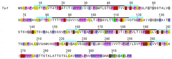 Amino acid sequence of the tuatara chain with four 34-residue repeats. Each repeat is marked with a solid black line. Bars at either end (turquoise) indicate short conserved regions believed to have a role in stabilization or assembly. Color coding for selected amino acids is as follows: cysteine (yellow), proline (magenta), glycine (grey), tyrosine (green), acidic residues (red), and basic residues (blue). Figure reproduced from [5] with permission of Elsevier.