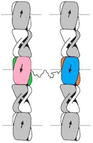 The structure of the mammalian α-keratins has been investigated since the 1930s, when early X-ray diffraction experiments showed a number of characteristic features in the so-called α-pattern—0.15 and 0.515 nm meridional reflections, a 0.98 nm equatorial reflection, and a near equatorial maxima. These data are consistent with the heptad-containing sequences forming a two-stranded α-helical coiled coil structure with an average pitch length of about 15 nm [80,81,82]. Crystallographic studies on intermediate filaments from various sources have nonetheless indicated that considerable local variations in pitch length do exist (see, for example, the review [83]). There is also a strong body of evidence that the KIF molecules are heterodimers with both a Type I and a Type II chain [84,85,86,87,88,89], and that the chains are parallel to one another (as distinct from antiparallel) and that they lie in axial register [84,90,91,92].