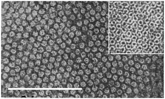 Electron micrograph of a cross-section of fine Merino wool showing the quasi-hexagonal packing of keratin intermediate filaments about 7–10 nm in diameter embedded in an osmiophilic matrix [70]. The magnification bar is 100 nm. The inset (at the same magnification) shows porcupine quill post-stained with potassium permanganate. The KIF have a ring structure. Figure reproduced from [71] with permission of Springer.