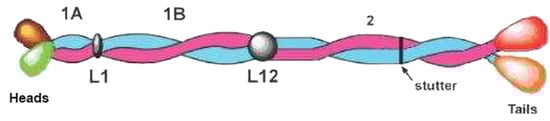 Schematic structure of the KIF molecule with a Type I and a Type II chain in axial register and parallel to one another. The 1A, 1B, and 2 segments have a heptad substructure and form a left-handed two-stranded coiled-coil with connecting linkers L1 and L12. At the N-terminal end of segment 2 the constituent chains have a hendecad repeat which causes the chains to lie approximately parallel to the axis rather than being coiled about it. The N-terminal (head) and C-terminal (tail) domains enclose the central rod domain. Figure reproduced from [71] with permission of Springer.