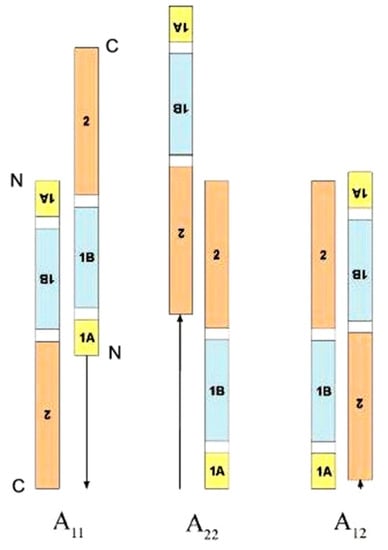 In total, three modes of molecular assembly are found in IF [82,87]. These are termed A11, A22, and A12 and involve the approximate axial alignment of antiparallel 1B segments, antiparallel 2 segments and antiparallel rod domains, respectively. The axial staggers for each mode are measured from the N-terminus of segment 1A in an up-pointing molecule. Figure reproduced from [71] with permission of Elsevier.