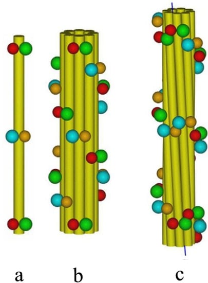 Models of (a) a single protofilament in the reduced state, (b) the reduced IF with eight protofilaments arranged on a ring of radius 3.5 nm, and (c) the oxidized IF, again with eight protofilaments, arranged on a ring of radius 3.0 nm. The yellow cylinders represent the rod domain of the IF molecules, whereas the spheres represent the terminal domains: green = both heads of the Up strands, red = both tails of the Up strands, blue = both heads of the Down strands, and orange = both tails of the Down strands. In (b) the terminal domains in the reduced structure are arranged on a two-start left-handed helix, thereby giving rise to a diagonal banding with a spacing of 22 nm. In contrast, in (c) the terminal domains in the oxidized structure with its dislocated lattice lie on a one-start helix of pitch length 23.5 nm. Figure reproduced from [97] with permission of Springer.