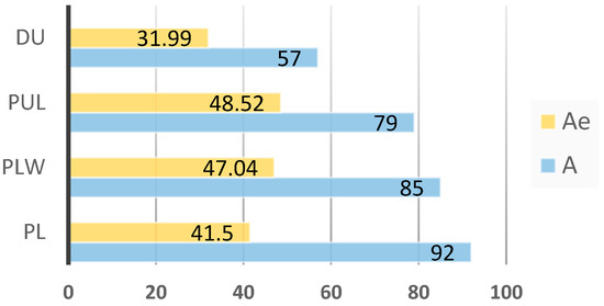 For the 14 STR loci analyzed, 101 alleles were detected in the 4 breeds studied (Table 2). The highest number of alleles was identified in SW857 and SW936 (10 alleles in both loci), and the smallest number (3 alleles) in the S0227 locus. Alleles established for the studied breeds in particular loci are presented in Table 2. The PL breed had the highest number of alleles, for which 92 alleles were determined, while the highest effective number of alleles occurred in the PUL breed (48.52 alleles). The lowest number of alleles and the lowest effective number of alleles (57 and 31.99, respectively) were established for the DU breed (Figure 2). The number of alleles and effective number of alleles averaged across loci and breeds were 5.62 and 2.90, respectively.