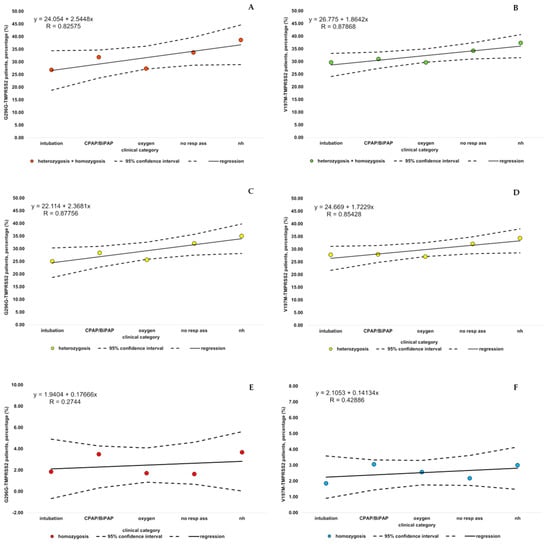 Prevalence of p.G296G or p.V197M in COVID-19 patients subdivided by different clinical outcomes. The percentages of carriers (A,B), heterozygous (C,D) and homozygous (E,F) individuals for p.G296G (A,C,E) or p.V197M (B,D,F) in each clinical category, i.e., patients who needed intubation, ventilation (CPAP/BiPAP), or oxygen therapy, patients who did not need oxygen therapy (no resp support) or were not hospitalized (nh), are reported. The 95% confidence interval around the regression line is calculated as the product of the regression standard error and the value of the 0.975-th quantile of a t distribution with 3 degrees of freedom.