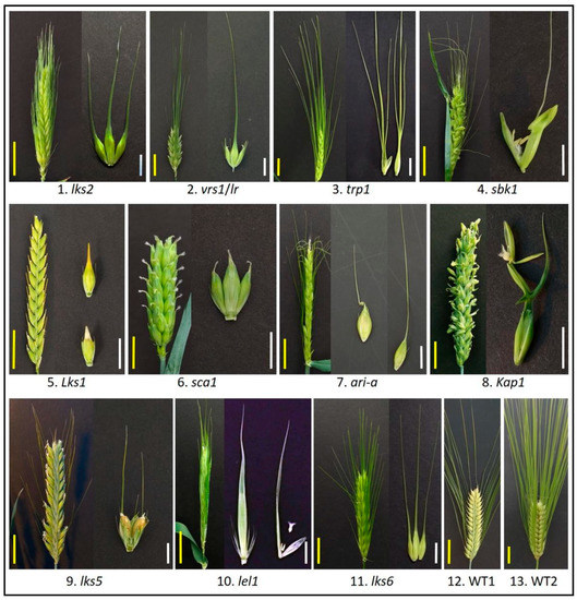Figure 1. Barley awn diversity. Barley awn mutants obtained from the National Small Grains Collection, USDA-ARS (Agricultural Research Service, United States Department of Agriculture), Aberdeen Idaho. 1-lks2, short awn; 2-vrs1(lr), six-rowed with awnless lateral spikelet; 3-trp1, triple awned lemma; 4-sbk1, subjacent hooded lemma; 5-Lks1, awnless; 6-sca1, short crooked awn; 7-ari-a, short awn; 8-Kap1, hooded lemma; 9-lks5, short awn; 10-lel1, leafy lemma; 11-lks6, short awn; 12-WT1, wild type, two-rowed with long awn; 13-WT2, wild type, six-rowed with long awn. Yellow scale bar = 3 cm; White scale bar = 1 cm.