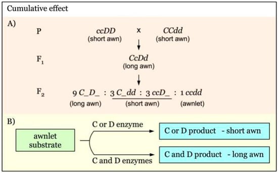 The cumulative effect of awnness genes controlling awn length is diagrammed in Figure 4A. C and D are independent genes with a cumulative effect on awn length [31]. An F2 segregation ratio of 9:6:1 for long to short to awnlet would be expected. C or D enzyme alone could convert awnlet to short awn phenotype. When both of them are present, their products are additive, giving rise to the long awn phenotype (Figure 4B).