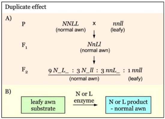 Gene interaction with a duplicate effect has been observed in the leafy awn mutants, as shown in Figure 5. N and L are independent genes with a duplicate effect on leafy awn morphology [28]. The presence of either of them will give a dominant phenotype, having normal awns. The N and L enzymes are redundant, and only one of them is sufficient to convert leafy awn substrate to normal awn product (Figure 5B). This type of gene interaction would give rise to an F2 segregation ratio of 15:1 for normal awn versus leafy awn (Figure 5A).