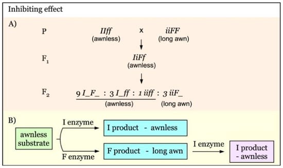 Gene interaction with an inhibiting effect is diagrammed in Figure 6. The I gene has an inhibiting effect on the dominance of F [30]. In the presence of I, the dominant effect of F is completely suppressed, producing awnless phenotype in F1 and an F2 ratio of 13:3 for awnless versus long awn (Figure 6A). In this type of gene interaction, I enzyme inhibits the transformation of the awnless substrate, giving awnless phenotype. In the absence of I enzyme, F enzyme will catalyze the conversion of awnless substrate into long awn product. When F enzyme encounters with I emzyme, F enzyme loses its activity, producing awnless phenotype, rather than the long awn phenotype (Figure 6B).