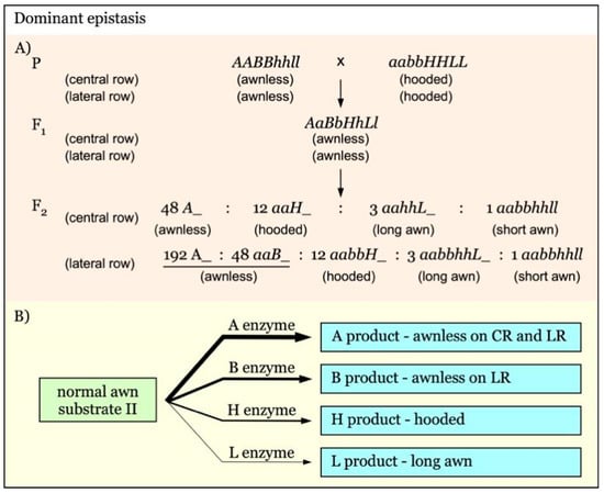 Gene interaction with hierarchical dominant epistasis is shown in Figure 7. In this model, A, B, H, and L are independent awnness genes with a dominant epistatic effect. The strength of their epistatic effect is in the order of A-B-H-L. The epistatic gene A exerts its function on both the central row (CR) and lateral row (LR), whereas B acts only on LR. The final awn phenotype is determined by the presence of the epistatic gene with the highest supremacy (Figure 7B) [21]. The expected F2 segregation ratio would be 48:12:3:1 for awnless to hooded to long awn to short awn on the central rows, and 240:12:3:1 for awnless to hooded to long awn to short awn on the lateral rows (Figure 7A).