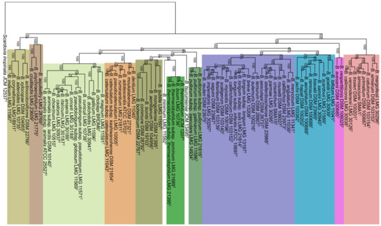 To infer the phylogenetic relationship among the type strains, the phylogenetic tree based on 362 strict-core proteins was used. The protein alignments were trimmed using trimAL (-automated 1 option) before concatenation [17], and the alignment was constructed using MAFFT version 7.313 [18]. The tree was built using RaxML version 8.27 using PROTGAMMA-BLOSUM62 substitution model and maximum likelihood method [19]. The tree was rooted with Scardovia inopinata JCM 12537T. The statistical reliability was evaluated by bootstrap analysis of 1000 replicates with the Bootstrap rapid hill climbing algorithm. The tree was visualized using iTOL (https://itol.embl.de/; accessed on 15 November 2019) [20].