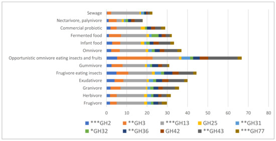 According to the Carbohydrate Active Enzymes (CAZy) system, each strain possessed from 33 to 166 genes (mean 88; SD ± 29.46). These genes spanned the wide range of CAZy families: 72 GHs (glycoside hydrolases), 17 GTs (glycosyltransferases), 10 CEs (carbohydrate esterases) and 2 PLs (polysaccharide lyases) and 20 CBMs (appended non-catalytic carbohydrate-binding modules). Shared among ≥80% of the strains were 10 GH families (GH2, GH3, GH13, GH25, GH31, GH32, GH36, GH42, GH43, and GH77), 5 GT families (GT2, GT4, GT28, GT35, and GT51), CE10, and CBM48. Among these families, the distribution significantly differed (p < 0.01) among hosts of different diets in 7 GH families (GH2, GH3, GH13, GH31, GH36, GH43, and GH77), 3 GT families (GT2, GT4, and GT35), CE10, and CBM48 (Figure 3 and Supplementary Figure S2). Considering the diversity of the gene distribution, we focused on the GH families.