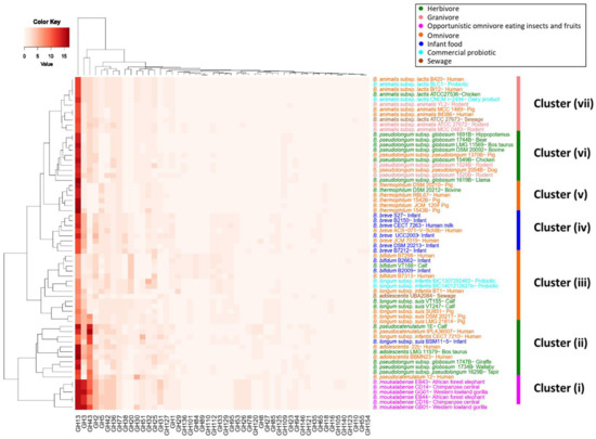 Clustering of 66 strains isolated from different sources based on their GHs. Heatmap displays the number of genes in GH families. Strains were colored according to their host dietary patterns as in the upper box. Strains were clustered in seven major groups: Cluster (i) Opportunistic omnivore; Cluster (ii) and Cluster (vi) Herbivore; Cluster (iii) and Cluster (v) Omnivore; Cluster (iv) Infant food; and Cluster (vii) Granivore and Insectivore.