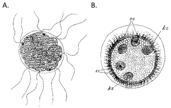 The appearance of germline and somatic cells in the evolution of metazoans. Two Volvocinian genera that were used by Weismann to illustrate the difference between (A) a homoplastid organism (P. morum) consisting of a single cell type and the evolution of (B) a heteroplastid (V. minor), which has evolved to consist of two primary cell types: the germline cells (Kz) that form the internal embryos and somatic cells (Sz), which are subject to death upon which the developing embryos are released.