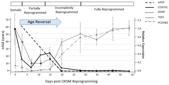 Age reversal precedes reversion of developmental state during reprogramming of fibroblasts using OKSM germline factors. Post-EFT genes (COX7A1, ADIRF) are rapidly reduced during early (partial) reprogramming (day 3–20) while a linear decrease in DNAm age is occurring. Pre-EFT genes are turned on at day 20 when DNAm age has gone to zero, and their expression increases as cells reverse their developmental state to full pluripotency (≥28 days). The data suggest the possibility of age reprogramming without permanent loss of cell identity. Figure is adapted from Olova et al. Figure 1 [162].